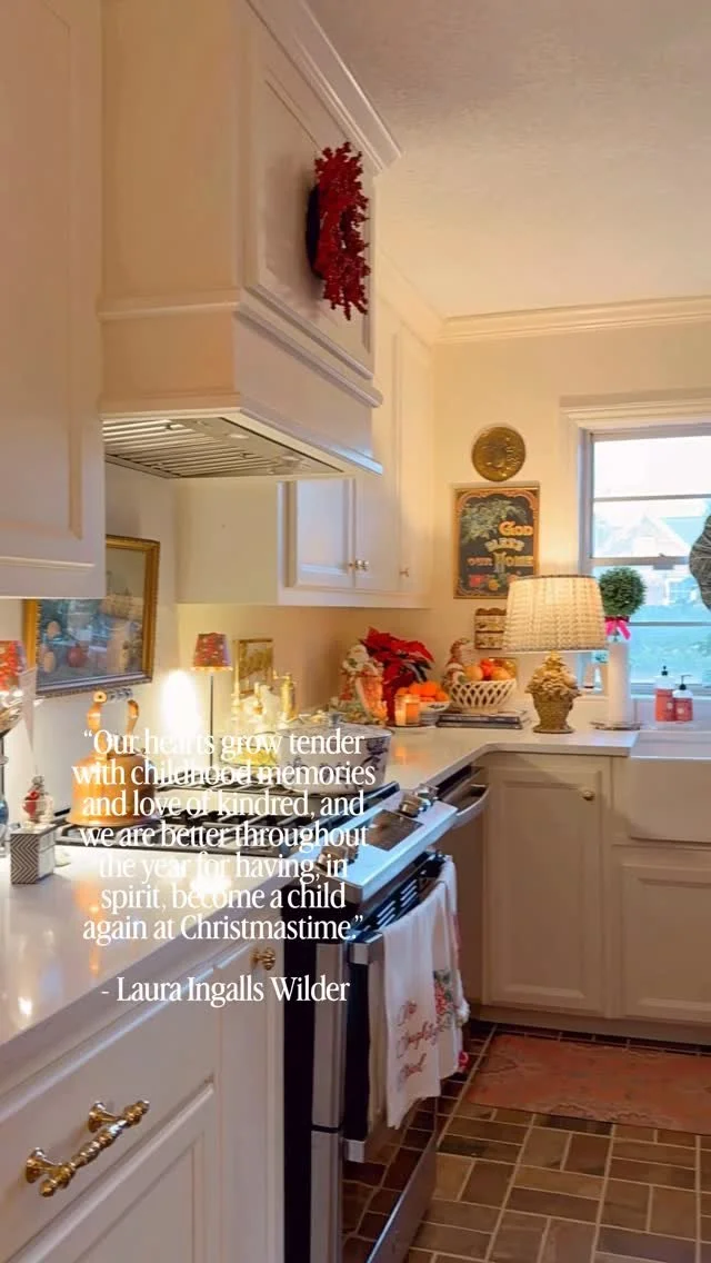 • Kitchen with neutral Benjamin Moore Linen White Cabinets and classic accents like Blue and White pottery and vintage decor items